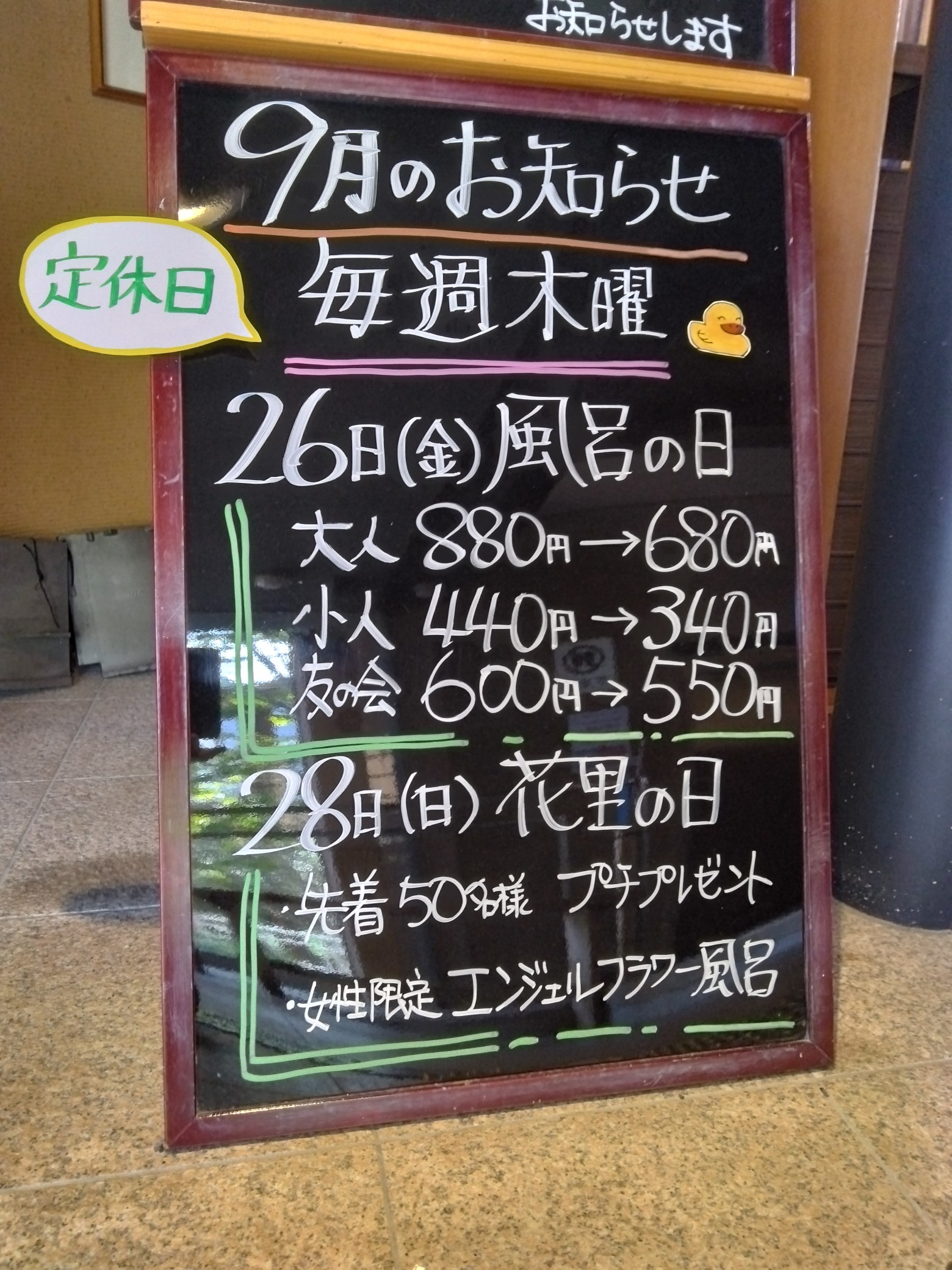 毎月26日は♨風呂の日♨ 2025年09月22日 秋風が心地よい季節となりました。 いつも花美人の里スタッフブログをご覧いただきありがとうございます。 26日(金)は風呂の日です。入湯料がお得になります! 28日(日)は花里の日です。今月のプチプレゼントは、入浴剤です。 皆様お誘い合わせの上、お越しください(^_^)/ 担当は山田でした。