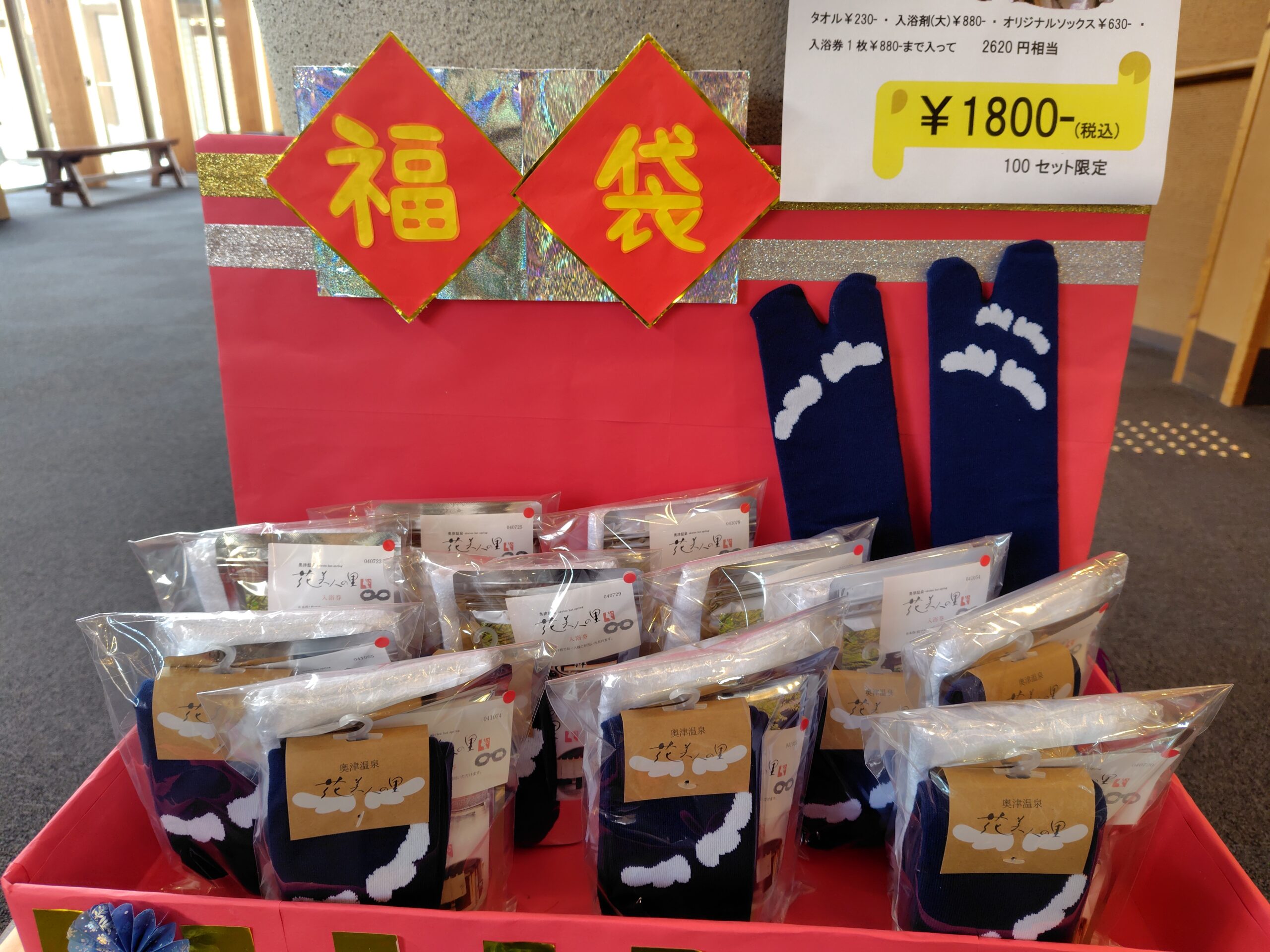 福袋絶賛発売中! 2026年01月05日 いつもブログをご覧いただき、ありがとうございます。 花美人では元日からお得な『福袋』を発売してます。 買ったその日からご利用いただける「入浴券」「花美人の里タオル」。入浴後にすぐ履ける「オリジナルソックス」。 お家でも花美人の里のお湯がお楽しみいただける「オリジナル入浴剤」。 2620円相当のグッズが入って 1800円!! とってもお得ですよ♪ 100セット限定販売ですので、お早めにGETしてくださ~い(^o^)/ 小林でした