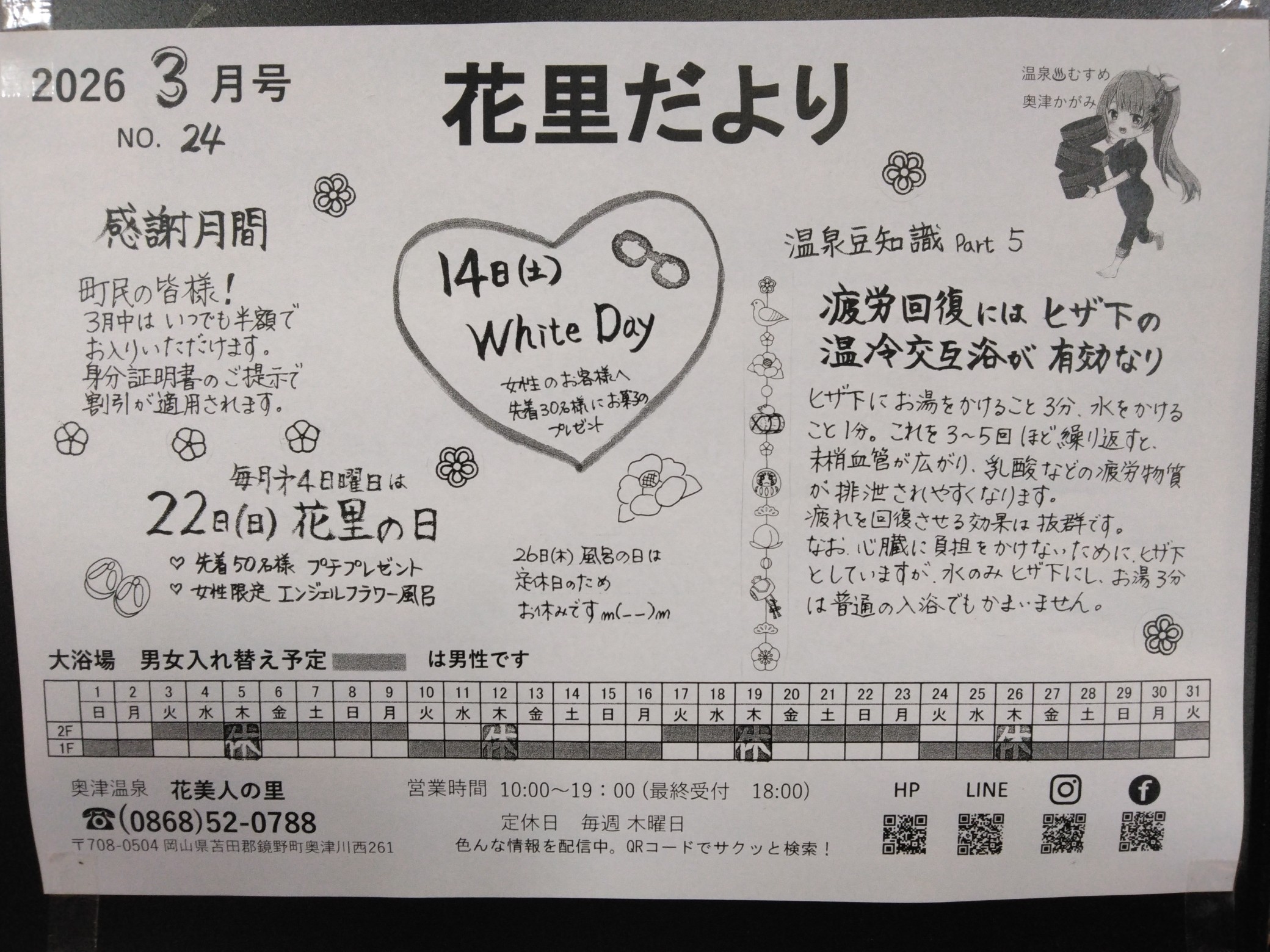 花里だより3月号です🌸 2026年02月27日 早咲きの梅がほころび始めました(^-^) 皆さまいかがお過ごしでしょうか? 花里だより3月号ができました(^^♪ 町民の皆さまは、身分証明書のご提示で3月中は、いつでも半額になります。 14日は、女性のお客様先着30名にプレゼントがございます。 【お知らせ】 『種』の販売が始まりました~✿ (今日はあいにくの雨で、画像が暗くなってしまい、見にくくて申し訳ございません。) 花や野菜の種です。温泉のついでにいかがでしょうか~? 担当は山田でした。