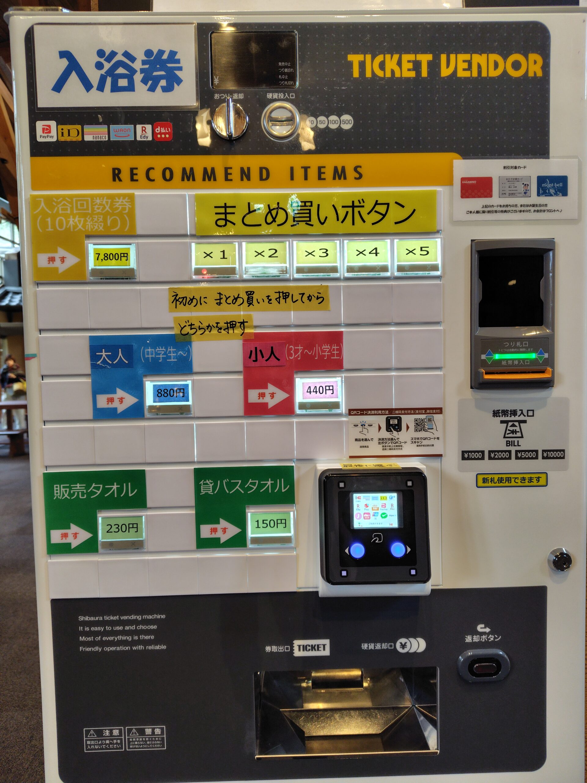 ①現金を1枚ずつ投入 ②まとめ買いを押してから 大人入浴か小人入浴のボタンを押す。 タオル、バスタオルの場合も同じように繰り返してください。